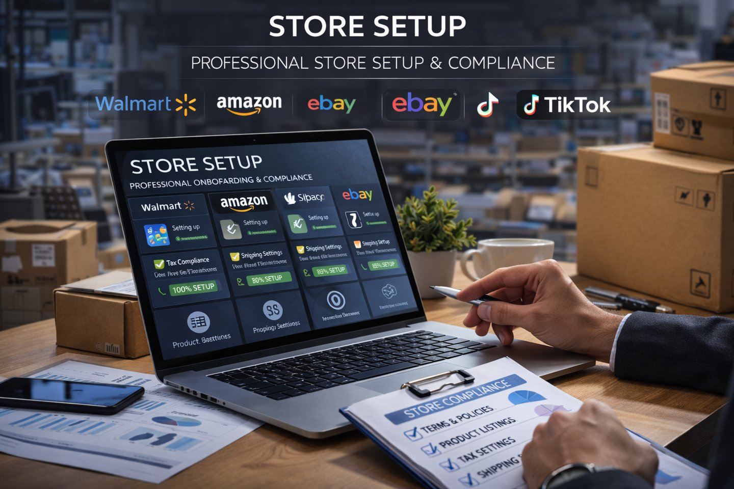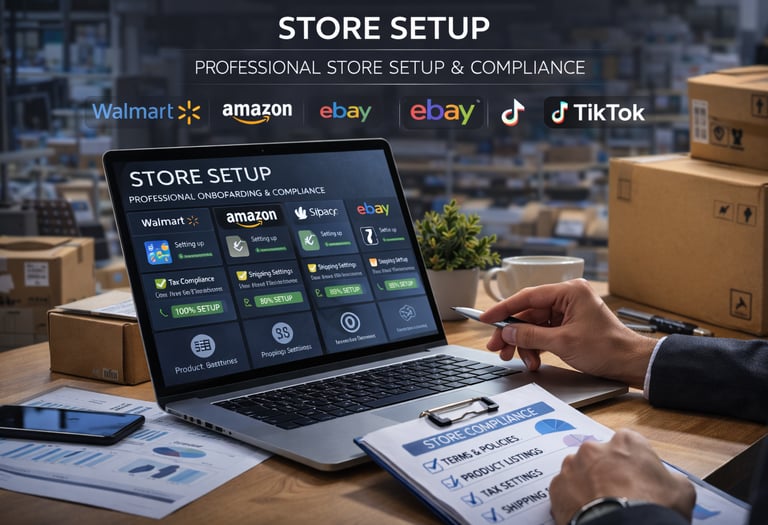 Professional store setup and compliance management for Walmart, Amazon, Shopify, eBay and TikTok — built for long-term marketplace success.